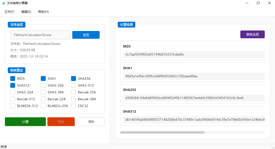 Hash文件哈希计算器是一款跨平台的文件校验工具,支持 MD5、SHA1、SHA256、SHA512 等 15 种主流哈希算法。采用左右分栏的简洁界面设计,左侧为操作区,右侧为结果显示区。支持拖拽文件、实时进度显示、一键复制结果等功能。基于 Qt 框架开发,使用多线程技术确保大文件计算时界面流畅响应。