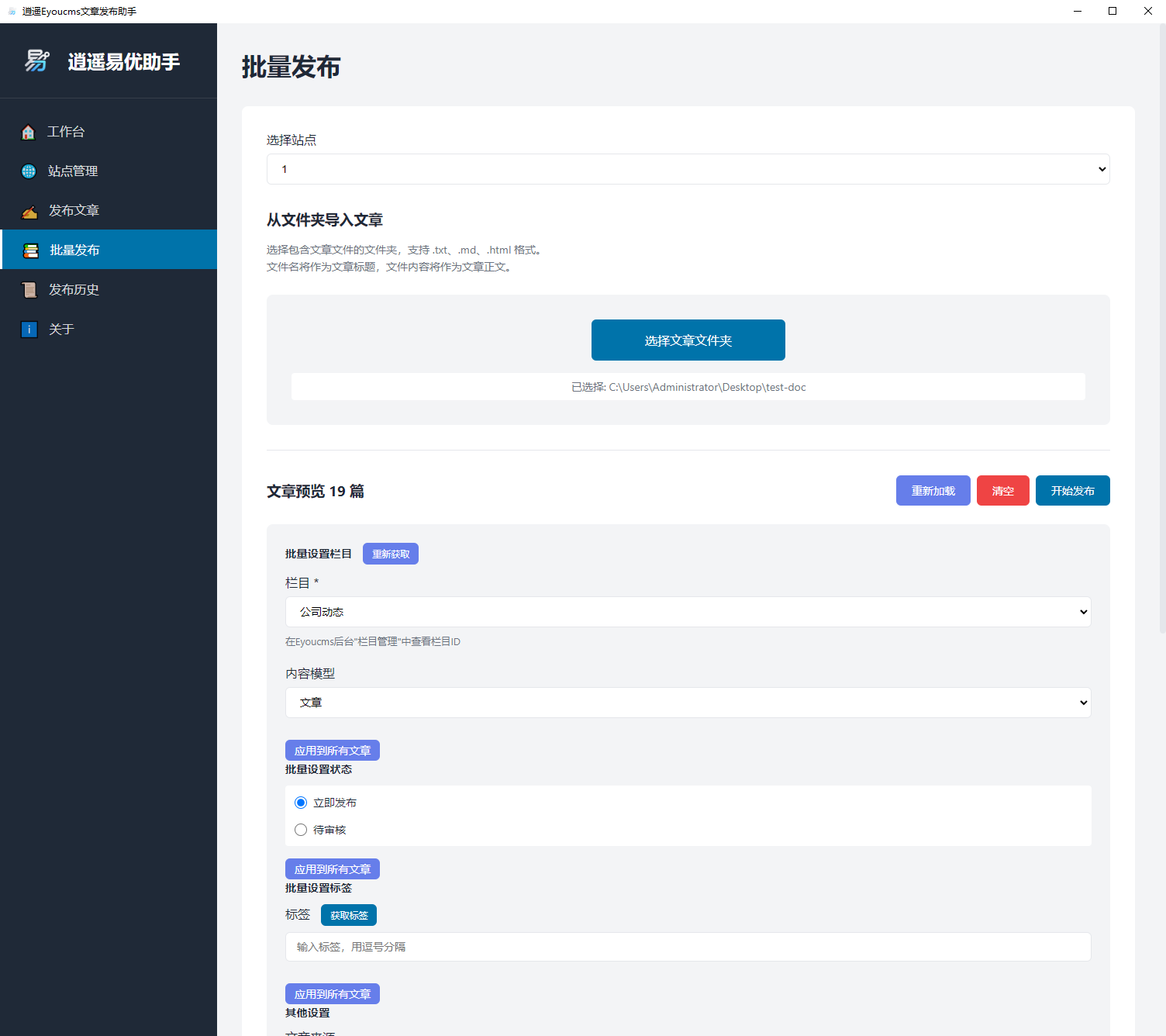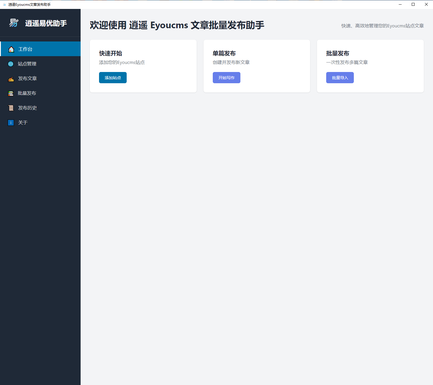 逍遥易优Eyoucms文章发布助手是一款专为易优Eyoucms内容管理系统打造的桌面端文章发布工具。软件通过直观的可视化界面,用户可以轻松实现单篇文章编辑发布和批量文章导入发布,支持多站点统一管理。内置智能SEO优化、自动标签提取等功能,大幅提升内容运营效率,是站长和内容编辑的得力助手。